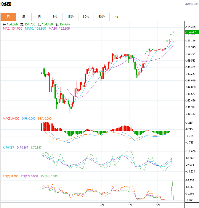 周三美市盘中,美元兑日元上升至-0.065,增幅-0.04%。周三(4月17日),美元/日元震荡微跌。在周一经历了爆炸性的看涨之后,美元/日元目前略低于155.00心理水平,盘中报154.544,跌幅0.1%。 货币对:美元/日元 行情分析:汇价高见154.730,低见154.450。上一交易日,汇价收于154.706。基本面上看,美元在