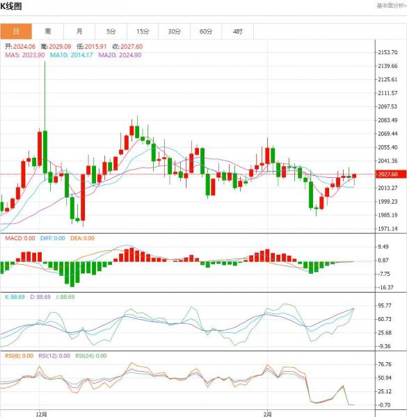新年以来成品油裂解差稳步小幅走高,这意味着当前区间原油价格没有给需求端带来明显压力,油价整体表现较为健康。但油价节奏持续性较差考验投资者的应对,相持局面下,投资者对机会选择需要更有耐心。 今日黄金价格技术分析: 从上周五到本周行情来看,黄金价格大幅反弹至2030美元附近,已重返