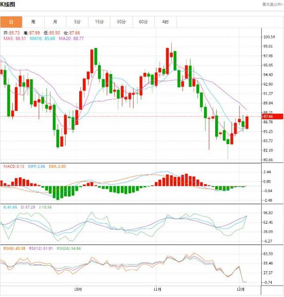 今日周一晚间,原油报87.76/87.78,黄金报1795.03/1795.33。周一(12月5日),国际金价触及7月初以来新高至1809.85美元/盎司。尽管美国就业数据强劲,但市场仍预计美联储将放慢加息节奏,以便实现经济软着陆。金价后市上看1815美元。 原油盘面分析 在欧佩克+开会并得出产量将保持在先前产量