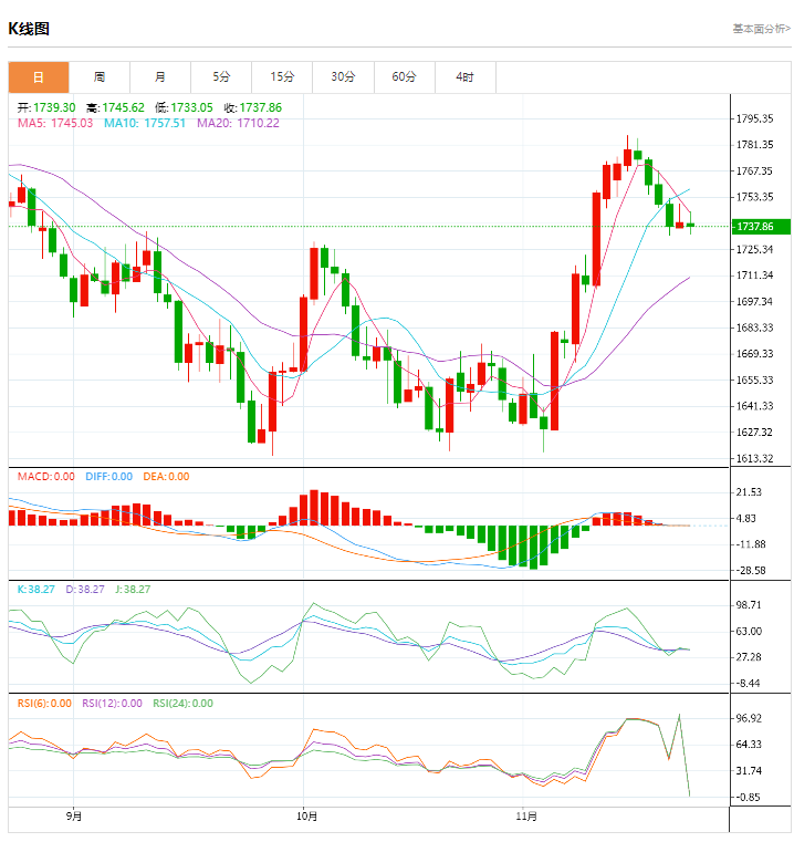 周三(11月23日),国际金价重新承压,但徘徊在1730美元上方附近,因投资者在美联储11月政策会议纪要公布前不愿大举押注。纪要可能强化加息路径放缓预期。尽管如此,美联储最终加息峰值可能会比预期水平略高。 今日黄金价格技术分析: 从4小时图来看,金价一度跌破上升趋势线支撑1775美元/盎