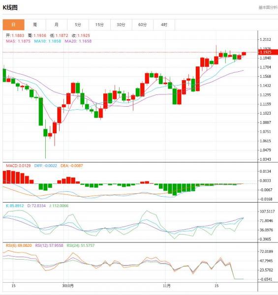 周三盘中,截止目前,英镑/美元货币对1.1926/1.1925,上升至0.0042,增幅0.35%。随着美国感恩节假期临近,加上美联储会议纪要即将公布,市场表现谨慎。美元小幅回吐本周稍早涨幅,非美货币也收复了部分失地,英镑在10日均线寻得支持。 货币对:英镑/美元 行情分析:汇价高