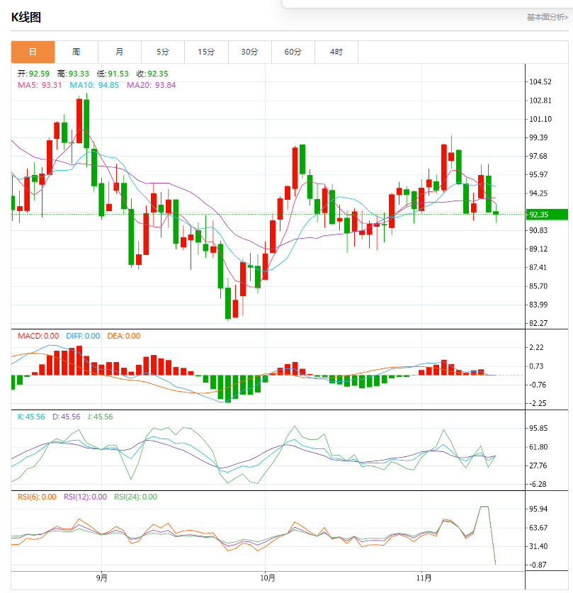 星期四(十一月十七日)亚洲时段,美国原油价格下跌超过1%,至每桶84.29美元,今天的国际油价继续下跌。由于对亚洲大国COVID-19的担忧加剧,以及病例数量继续攀升,油价近期下行风险依然存在。 今日原油价格技术分析: 日线级别:震荡;ACD死叉,KDJ死叉,油价跌破所有均线,后市略微偏向