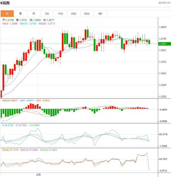 周二盘中,英镑/美元下跌至-0.0031点位,跌幅-0.25%。英镑/美元走势图目前呈现整体看跌势头,显示出下行趋势。价格可能会继续向第一个支撑位看跌。 货币对:英镑/美元 行情分析:汇价高见1.2721,低见1.2662。上一交易日,基本面上看,英镑昨日震荡盘整,日线小幅收涨。除空头回补对汇价构成了一定的支撑