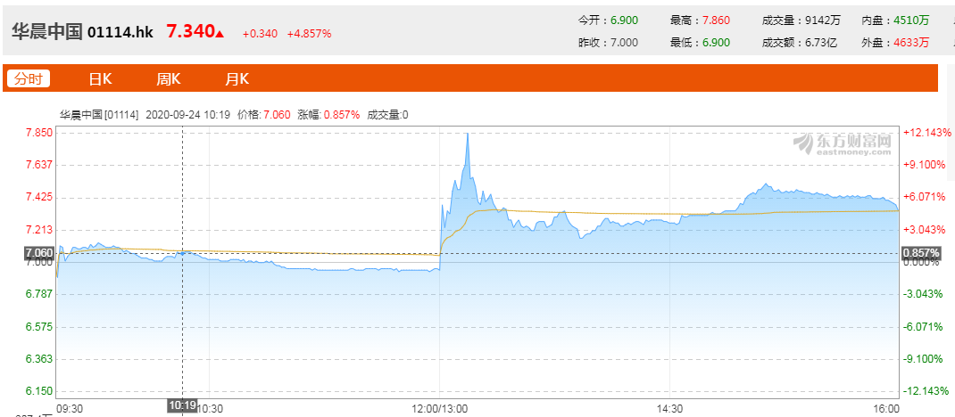 9月24日消息,据外媒援引五名知情人士透露,辽宁交通建设投资集团将牵头对华晨中国的私有化计划。受此影响,华晨中国股价盘中垂直上升逾5%,最高涨幅超12%。 华晨集团针对“华晨中国私有化”做出回应称,公司没有得到任何方面的相关消息,切勿被不实信息误导。在这之后华晨中国股价出现短时回落,涨幅收窄至3%