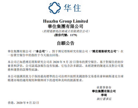 华住集团发布公告,公司发行约2042万股,每股定价297港元,每手50股,预期9月22日上市。297港元较美股折让8.8港元,公司在香港暗盘涨2%,报303.2港元,今日开盘,华住涨2.69%,报价305港元,总市值2011亿港元。 华住集团-(01179.HK)发布公告,公司已知悉博尼塔斯研究公司在2020年9月22日发布的卖空报告。基