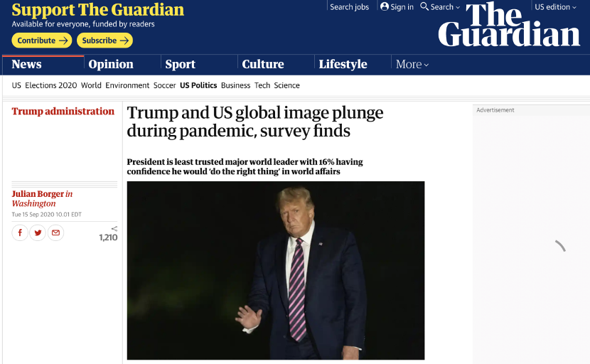 皮尤研究中心(wRarchCtr)是美国的一间独立性民调机构和智库机构,它致力于研究影响世界的问题、态度与潮流。该中心在美国乃至世界颇具盛名,其研究结果常常被全球各大媒体所引用。 近日,皮尤中心公布了一项全球调查,其结果显示,由于美国政府应对疫情不力,美国国家形象和美国总统特朗普的个人形