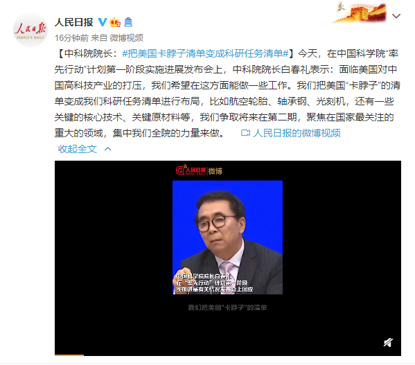 9月16日讯,今天,在中国科学院“率先行动”计划第一阶段实施进展发布会上,中科院院长白春礼表示:面临美国对中国高科技产业的打压,我们希望在这方面能做一些工作。我们把美国“卡脖子”的清单变成我们科研任务清单进行布局,比如航空轮胎、轴承钢、光刻机,还有一些关键的核心技术、关键原材料等,我们争取将来在第二
