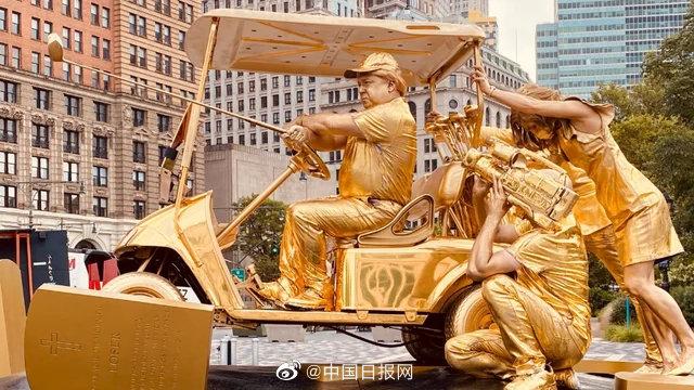 据美国国会山网站报道,当地时间8日,展现美国总统特朗普驾车驶过新冠病毒逝者和美国战争死者坟墓的活雕像在纽约曼哈顿展出。 涂有金漆的演员们,展示了特朗普驾驶高尔夫球车驶过坟墓,他身后是用力推车的福克斯新闻主持人劳拉·英格拉汉姆和肖恩·汉尼提。 报道称,“特朗普雕像倡议”(TrutatuIitiativ
