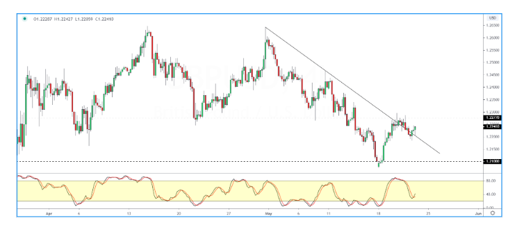 日内英镑/美元在1.2215附近窄幅整理交投后突然加速展开跌势,盘中最低触及1.2161,目前自低点略微有所反弹,日内跌幅为0.30%。 此前英镑/美元在涨至1.2277后迅速回落,这可能表明汇价在这一水位面临阻力。 而下行方面,英镑/美元于趋势线获得动态支撑,若之后进一步反弹,则将于1.2277水平再度面临考验。