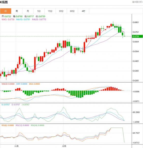 澳元周四持稳,欧洲时段交投于0.6732,上涨0.02%。此前澳元连续四天下滑,下跌1.6%。当天晚些时候,美国将公布失业申请和AD就业报告,该报告仅比美国非农就业数据提前一天发布。 中国12月财新服务业采购经理人指数升至52.9,高于11月的51.5,超过市场普遍预期的51.6。强劲的读数帮助澳元今天企稳。中国