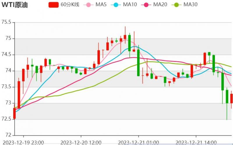 原油总库存出现了自第二季度以来相对于季节平均水平的最大连续库存消耗。2024年第一季度欧佩克+的减产协议如果能够很好的执行,原油价格反弹可能将会出现。 今日原油价格技术分析: 原油昨日打破周初强势台阶上升格局,尾盘收在低位。截至12月8日的一周,美国原油库存意外增加约290万桶,出乎人们