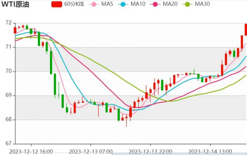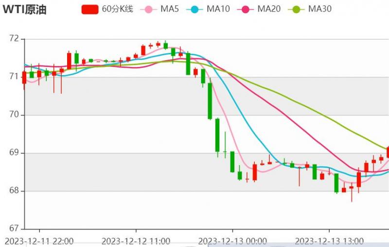 周四(12月14),美原油连续在测试70美元关口后下跌,后企稳回升,再次向70美元关口逼近。现报69.78%,跌幅0.08%。北京时间周四凌晨,在美联储维持利率不变,并表示将在2024年开始降息后,原油价格保持涨势。美联储维持利率和降息预期对原油价格起到支撑。较低的利率降低了消费者借贷成本,从而促进经济增长和石油需
