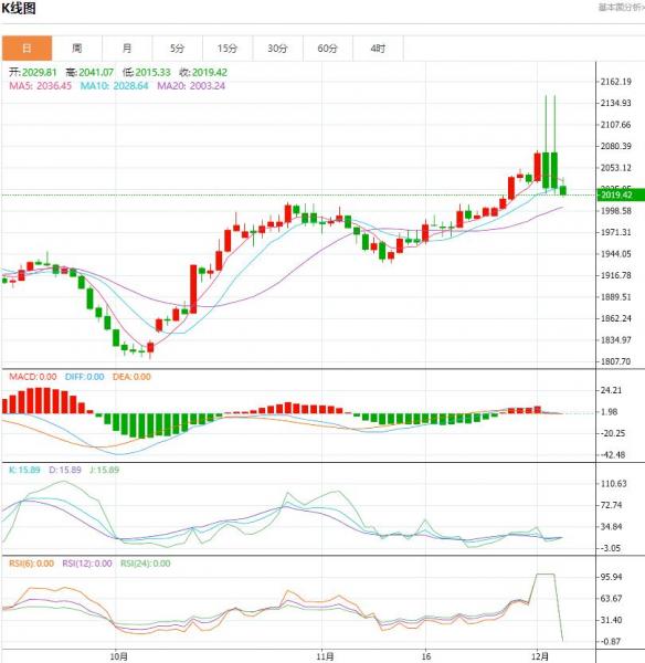 周一(12月4日),国际黄金回吐亚盘的全部涨幅,目前转跌回落至2070美元下方,今日稍早金价一度冲破2100美元,刷新历史高位至2144附近,不过这一疯狂的升势目前回归平静,市场本周聚焦美国非农数据。 今日黄金价格技术分析: 在日线图上的相对强弱指数(RI)极度超买的情况下,黄金价格回落,但金价