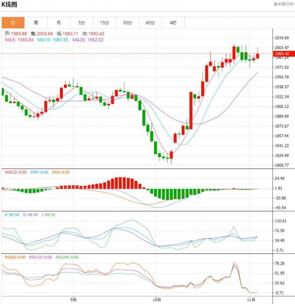 周一(11月6日),随着美债收益率小幅回升,黄金面临压力,日内自1990美元上方回落,尽管上周非农币预期疲弱令美联储降息预期提前,但金价似乎对此并不兴奋。本周来看,黄金将继续追踪中东局势,与此同时,本周美联储多位官员将登场,包括美联储主席鲍威尔。 今日黄金价格技术分析: