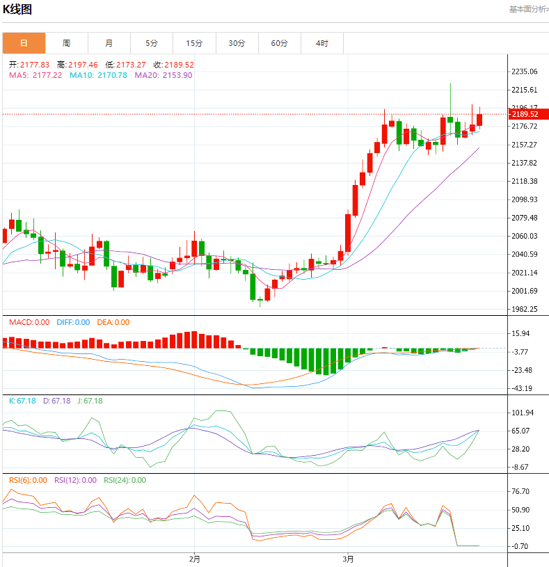 周三(3月27日),现货黄金窄幅震荡。金价周二小幅攀升,盘中一度逼近2200关口,因对美联储降息的预期增强,不过,随着美国耐用品订单数据强于预期,美元指数扭跌为涨,金价涨幅收窄至0.3%,收盘报2178.49美元/盎司。 今日黄金价格技术分析: 现货黄金价格震荡走平,投资者在复杂的市场信号中穿行。黄金