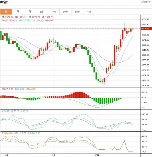 星期四(十月二十六日),油价跌0.15%。欧洲严峻的制造业和服务业数据凸显了欧洲经济面临的阻力,造成对未来石油需求的忧虑。此外,根据欧洲央行周三的数据,整个欧元区的银行贷款几乎持平,加剧了未来的困难时期。 黄金盘面分析: 随着10月份商业活动改善,美国经济数据推动美国国债收益