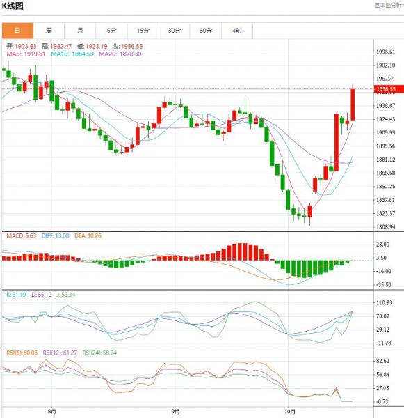 周四(10月19日)进入欧市盘中,市场情绪谨慎,投资者等待关键的美联储主席鲍威尔的讲话,与此同时,中东局势仍处于令人不安的紧张氛围中,黄金维持高位盘整姿态,目前交投在1950美元附近,等待今日的进一步线索。金价徘徊在两个半月高位附近,因中东动荡升级提振对黄金的需求,同时投资者等待美联储主席鲍威尔定于今日