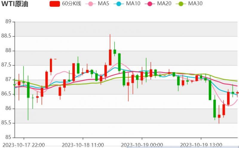 星期三(十月十八日),原油价格交投于88.50美元/桶附近。有分析人士认为,油价当前来回变化,能源交易商正在关注美国的外交努力能不能成功阻止以色列-哈马斯冲突升级为更广泛的地区战争。星期四(十月十九日)亚欧时段,原油价格下跌,截至发稿,交投于86.35美元/桶附近。不过,中东紧张局势让昨天的油价得到了
