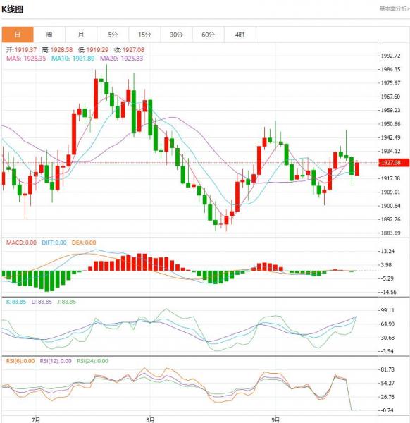 星期五(九月二十二日),原油价格震荡上行。因现货市场紧张局势缺乏缓和迹象,油价上涨继续呈现强劲势头。 黄金盘面分析: 在美联储加强利率鹰派立场后,受美元和美国债券收益率飙升的拖累,金价延续跌势。黄金可能需要依靠美国国债收益率上涨势头放缓才能实现显着的反弹。美联储周三维持
