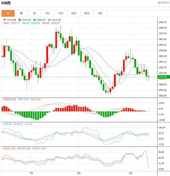 周三(9月13日)进入欧市盘中,市场在关键的美国CI通胀报告出炉前保持谨慎,美元维持升势,黄金则走弱测试1910支撑位。市场普遍预测8月美国整体通胀将升温,这将对下周将召开利率决议的美联储产生一定影响。 今日黄金价格技术分析: 金价已经结束在21日移动均线1917美元/盎司和50日移动均线1932美