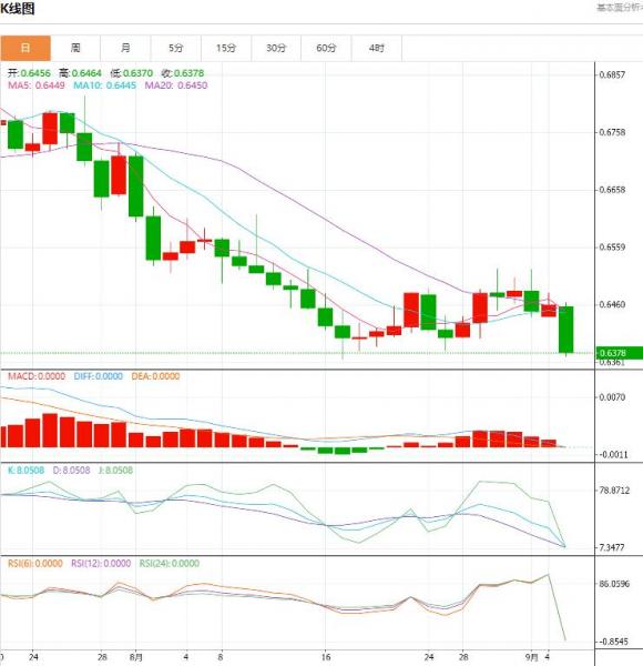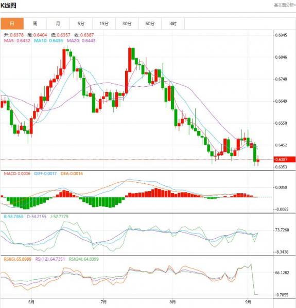 周二盘中,澳元/美元下跌至-0.0082,跌幅-1.28%。由于交易员密切关注该地区波动的市场状况,澳元在周一交易中小幅上涨,在周二的交易中大幅度下挫。考虑到周一美国劳动节假期的影响,这很可能会加剧周二的波动。 货币对:澳元/美元 行情分析:汇价高见0.6464,低见0.6370。上一交易日,汇价收