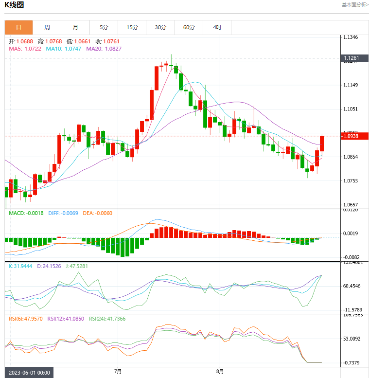 周四盘中,欧元兑美元下跌至-0.0055,增幅-0.51%。欧元区8月通胀停止放缓,这对欧洲央行官员来说是一个警示信号,因为他们要权衡通胀压力是否过于顽固,以至于到了不敢冒险暂停加息的程度。受能源因素影响,欧元区8月CI年率录得5.3%,与上个月持平。 货币对:欧元/美元 行情分析:汇价高见1.0939