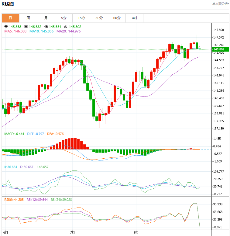 货币行情走势分析: 美元/日元在周二欧洲时段升至数月高点,但在疲软低迷的美国经济数据公布后抹去涨幅并大幅反转。下午晚些时候,该货币对下跌0.35%,报146.00点,上午最高触及147.37点。当天早些时候,最新的消费者信心调查显示,8月份消费者信心大幅下降,降幅超过预期,从之前的114.00降至106.01,并抹去了