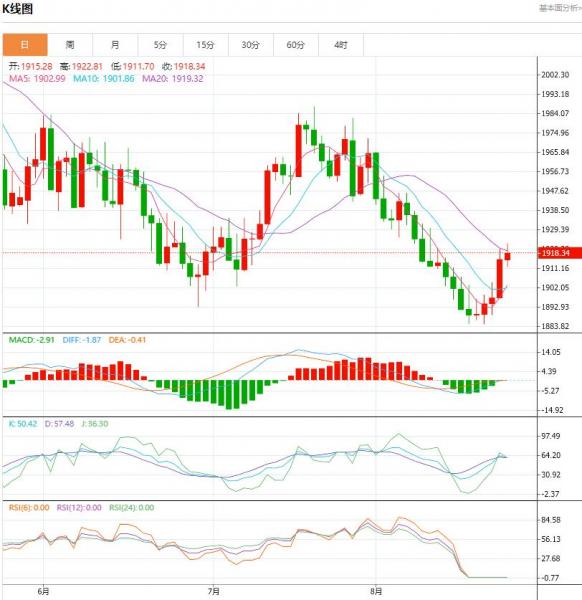 星期四(八月二十四日)亚欧时段,美原油徘徊在近一个月低点,主要经济体系疲软的制造业数据盖过了对美国原油库存下降超过预期的乐观情绪。隔夜油价一度跌至每桶77.61美元,创下7月24日以来的新低。 黄金盘面分析: 随着债券收益率下降,金价迅速回到1900美元/盎司上方。目前交易价格为192