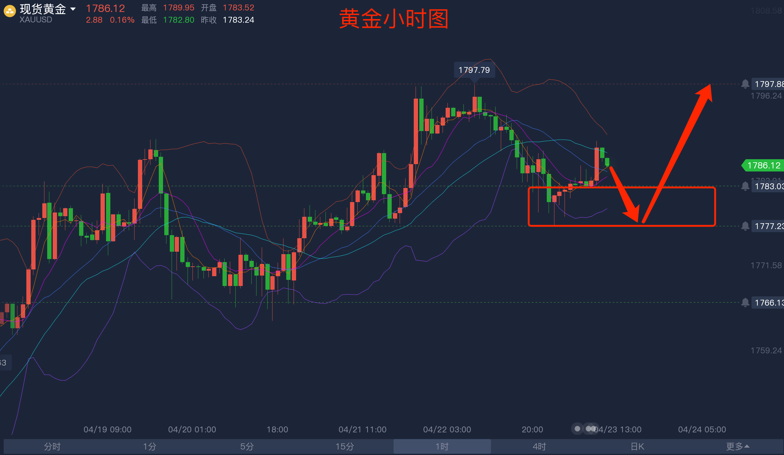 周四黄金价格早盘达到1797后开始下跌,最低达到1777后反弹,晚间给出分析,保持区间操作,在1780-1782区间的多单晚间到达1788获利满满。隔夜收盘价格在1783盎司,今日平开后金价还是走的反弹行情,目前交投于1788附近。今日是本周的最后一个交易日,黄金有望再去触及1797的高位,如果破位上方空间还是很大的。