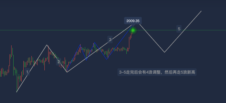 黄金亚盘并没有实质性的突破,最终以震荡结束,欧盘开盘,给了一波小幅反弹,整体盘面给我们的视感依然偏于强势,自1906止跌以来,高点一直抬高,目前还没有给出比较明确的空头信号,这个是大家需要持续关注的。 大格局中本月会有4浪调整,这个调整幅度会很大,至少在150-200美金左右,什么时候调整,需要等5-5