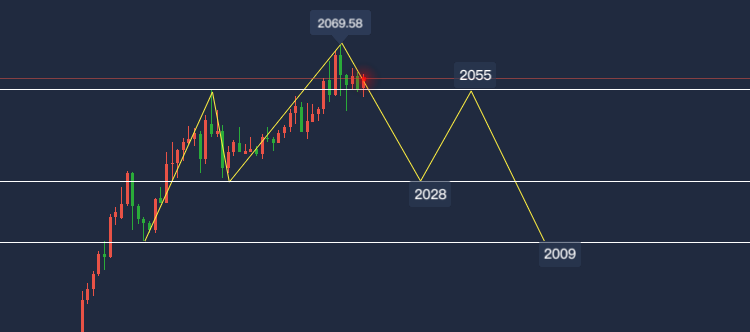 黄金昨天欧盘成功上破2030谐波位置,并且站稳迟迟不下,说明短期2030得到了一定支撑,美盘后动力十足,最终以2055.6结束了这波涨势,凌晨2次回落受到2030支撑后走出了震荡盘整,周四黄金短线行情会怎么走,大格局中什么时候开始回落。我给出一些我个人的倾向提供大家提供参考 如上图为小周期5浪上行结构