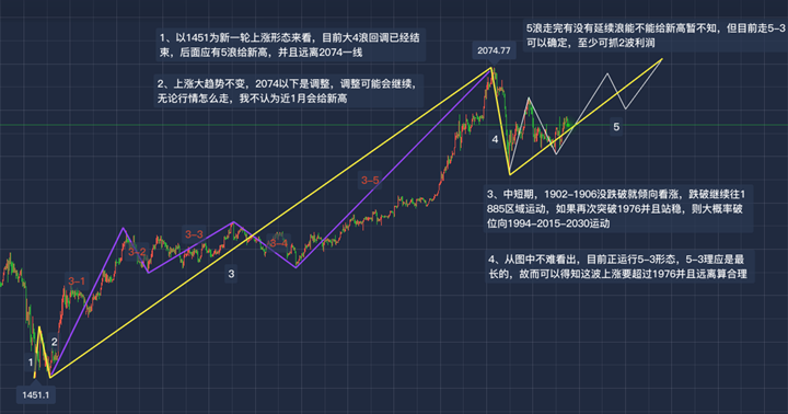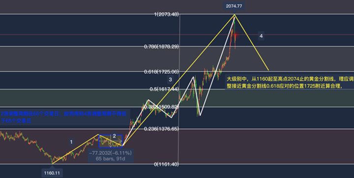 黄金白银空头终于没力气了,周三止跌于1862,昨天开盘一路上涨,无下引线,属于典型的强势反弹,黄金白银后市会如何,我认为会进入一段2-3个月的调整阶段,理由如下。 如图,黄色线为1、2、3浪形态结构图,白色线为主推3浪,视1160-1344为1浪,视1268-2074为主推3浪,因今年疫情的原因,导致3浪的结构和