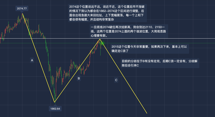 黄金昨天来回过山车,亚欧盘先是延续周一多头惯性动能,美盘遇阻2015一线后出现闪崩40美元走势,未来黄金会怎么走,还会不会继续上涨?我先说一下我的倾向和思路,先说一下大局展望,这个是非常重要的,2074这个位置说远不远,说近不近,按照最近的波动,2天的涨幅即可破位年高点2074,这个位置后市不涨破的情况下我