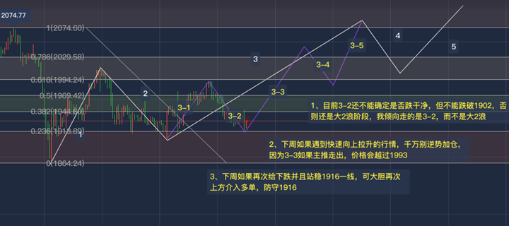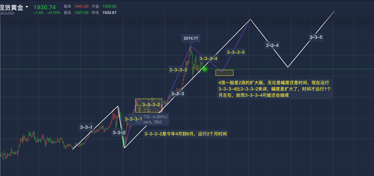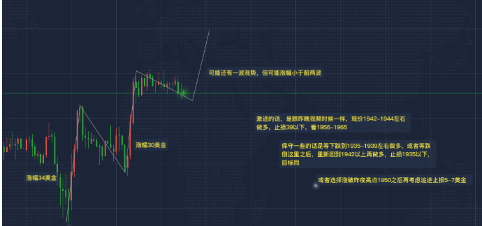 鈥A533黄金周四最高反弹到了1966,是我的一个目标位置,但仍然只是大震荡里的一环。 这是周四白天在1940-1942左右的时候我的一个示意图,以及当时的建议。 当时的意图其实是两个: 1、盘整钝化,理应继续上看,也比较符合小5浪走势完整。 2、第一段上涨是34美