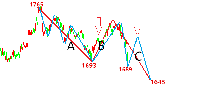 黄金波段内的几个重要位置和反弹方式如下,考虑黄金反弹,和考虑继续下跌,目的不是为了做反弹,而是去考虑重新短线重新做空的位置,也是为了考虑如果涨破了什么点位,我们暂时不能做空的问题,这点大家要明确。 第一种:如图,黄金高点1765美元下跌至昨天低点1689美元一线,这个期间走完了A线后,后续