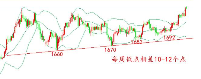 黄金合理回调,多头不必过于忧心。 黄金昨天大跌至1718美元一线,不知道有没有同学在高位做多单,如果有,不用担心,出局的机会很大,如果低位还有空单,速速处理,理由如下,我给大家详细说来。 1、如图,大家把周线图打开,看一下最近四周的一个低点位子,第一周低点1660,第二周1670,第三周1682,本