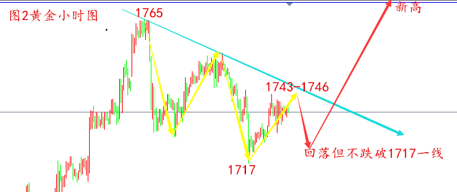 黄金一周结束后,孙策老师认为明显是调整市,我列的两种可能是我认为最大概率的两种,其实还有其他的,我觉得无意义,大家看一下。 第一种:没有跌完,跌破1717本周低点应该会继续向下加速到1713-1705一线,那时候孙策老师更倾向于会运行图1黄色通道下沿线1693-1695左右。 1、跌破1717之后考虑轻仓