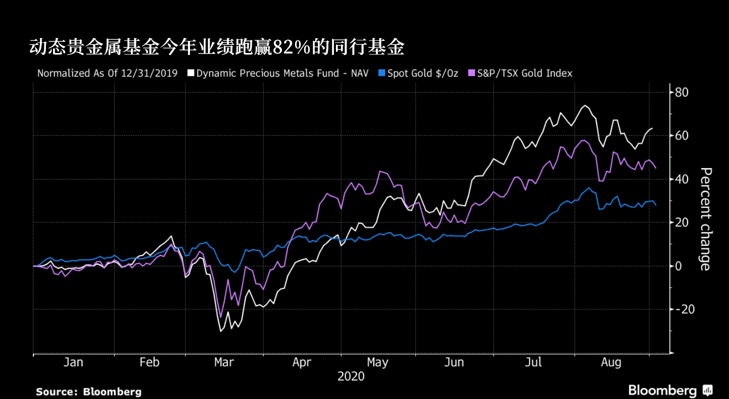 动态贵金属基金(DyaicrcioutalFud)是加拿大丰业银行的子公司,其投资组合经理罗伯特·科恩表示:动态贵金属基金今年击败了82%的同行,目前已经把黄金作为对冲11月美国大选风险的资产。 据彭博社数据显示,这只专注于贵金属交易的基金今年迄今已上涨了63%,主要投资资产包括黄金和白银相关的股票,目前该