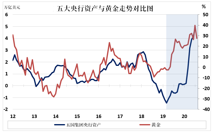一、黄金市场近期概况 近几个月来,由于担心疫情打击全球供应和需求、可能导致通缩,各国政府和央行被迫大规模、持续地干预市常 在这种情况下,各大央行资产负债规模的飙升引起了市场的关注。如下图数据显示,五大央行(美联储、欧洲央行、日本央行、中国央行、英国央行)的资产从2019年3月的负1.5万亿美元飙升到2020