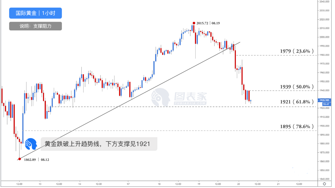 黄金形成假破位反转形态,若价格跌破1921则见1900关口。 价格跌破上升趋势线支撑后大幅下行,已经跌破斐波那契50%回调位1939,若价格继续走低,下方支撑见斐波那契61.8%回调位1921,破位则见1900关口,以及斐波那契78.6%回调位1895。 若价格反弹上行,上方阻力见1939,接着是斐波那契23.6%回调位1979