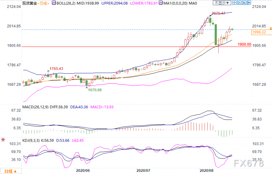 黄金再度回落2000美元关口下方,因部分投资者获利了结。前一交易日,金价震荡剧烈,创近一周新高至2015.59美元/盎司后大幅跳水30美元,随后再度快速回升。虽然部分投资者锁定获利,但美元指数跌至两年低点,也令金价回落幅度有限。随着美联储继续压低名义利率,且通胀预期有所上升,分析师普遍维持年底金价在2000美元/盎