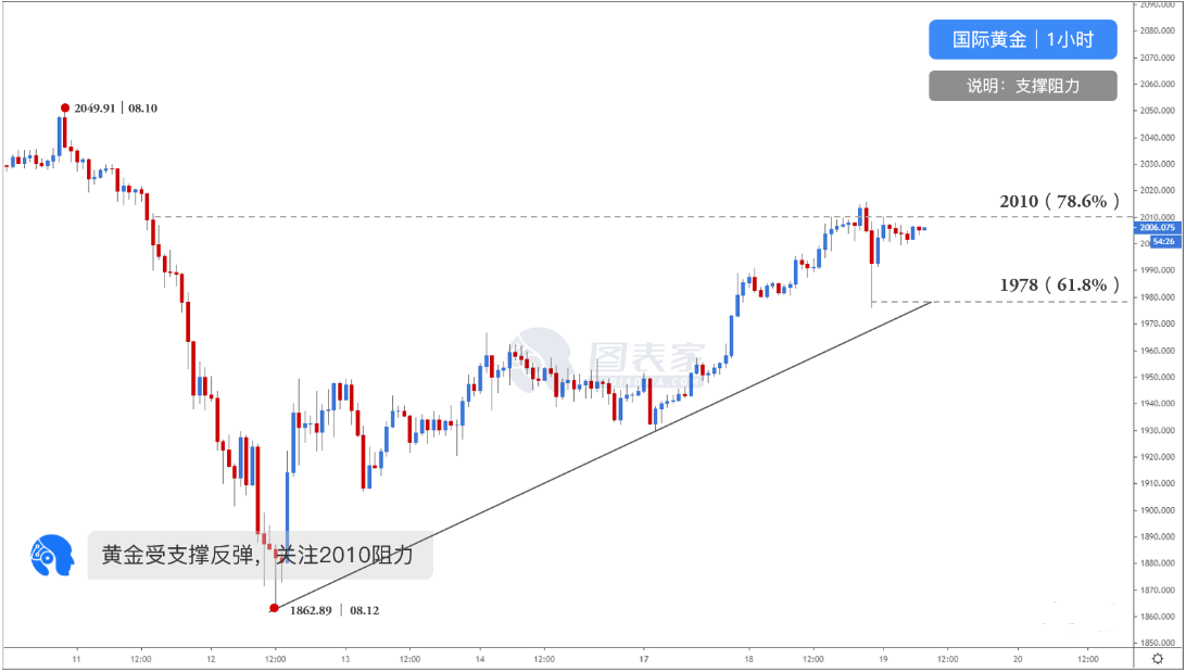 黄金守住1978支撑后再次站上2000关口,若2010破位则见2050。 图为黄金1小时走势,价格测试斐波那契61.8%回调位1978支撑后反弹,目前价格正在测试斐波那契78.6%回调位2010附近阻力,若该阻力破位,则前高2050。 若价格受阻回落,下方支撑见1978,该水平也在上升趋势线附近。 观点:短线看涨,关注2010