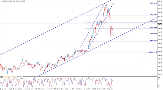 周五(8月14日)亚市早盘,现货黄金短线快速拉升,金价最新突破1960美元/盎司关口。知名财经网站cooi.co周五撰文,对金价后市走势进行分析。 因美元走软,且中美局势依然紧张,金价周四从上个交易日触及的近三周低点反弹,盘中一度上涨2.5%。 现货黄金周四收报1953.02美元/盎司,大幅上涨37.31美元或1.95%,现货黄