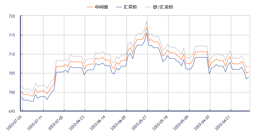 美元兑换人民币汇率(2020年7月20日) 类别 汇买价 钞/汇卖价 中间价 更新时间 美元兑换人民币汇率 698.58 701.54