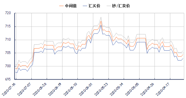 美元兑换人民币汇率(2020年7月16日) 类别 汇买价 钞/汇卖价 中间价 更新时间 美元兑换人民币汇率 697.89 700.84