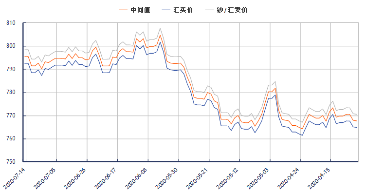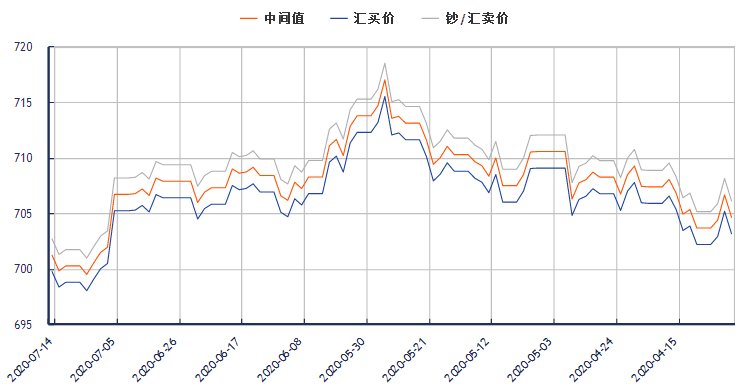 美元兑换人民币汇率(2020年7月14日) 类别 汇买价 钞/汇卖价 中间价 更新时间 美元兑换人民币汇率 699.63 702.6 699.96 10:03:52 美元对人民