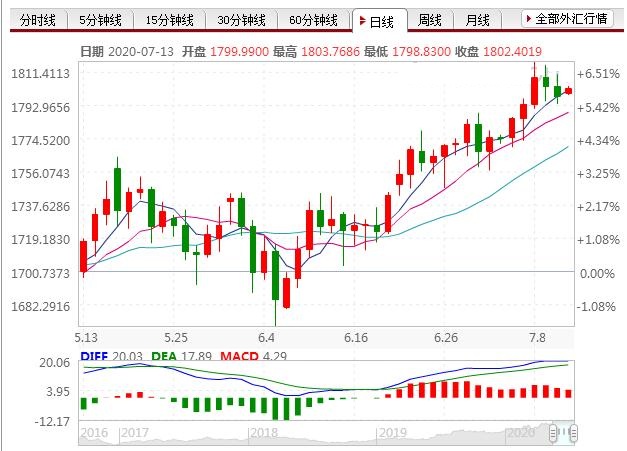 FX168财经报社(香港)讯周一(7月13日)亚市午盘,国际现货黄金位于1803美元/盎司区域。上周金价近9年来冲破1800美元关口,之后连续2个交易日自高位回落,一度跌穿1800美元关口。但整体来看,金价依旧维持韧性,目前重回1800美元关口上方。 上周五(7月10日)国际现货黄金亚市早盘开于1802.81美元/盎司,
