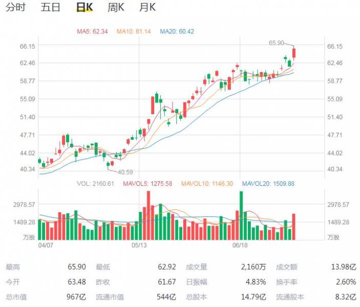 最高65.90最低62.92成交量2,160万成交额13.98亿 今开63.48昨收61.67日振幅4.83%换手率2.60% 总市值967亿流通市值544亿总股本14.79亿流通股本8.32亿 周三美股盘初,京东(JD.U)股价拉涨,触及历史新高的64.79美元。 此前该公司宣布,旗下京东家电专卖店数量已突破1.5万家,进一步实现对全国2.5万个乡镇、60万个