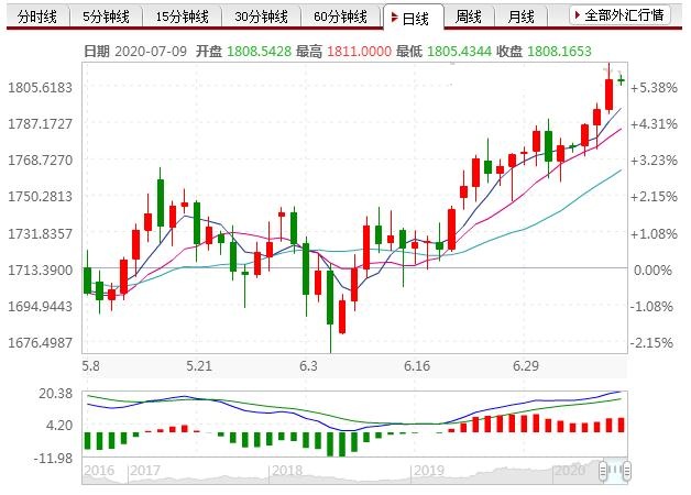 周四(7月9日)亚市早盘,国际现货黄金位于1808美元/盎司区域。上一交易日金价一路扶摇直上,自2011年9月、近9年来首次站上1800美元大关,一度紧逼1800美元大关,最高触及1818.06美元/盎司。之后金价自高点有所回落,目前暂于1808美元区域徘徊。 上一交易日国际现货黄金亚市早盘开于1794.20美元/盎司,最高涨至