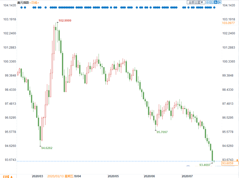 亚汇外汇网提供了现在美元指数是多少(2020年7月28日): 现在美元指数是多少(2020年7月28日) 类别 最新价 开盘价 昨收价 美元指数 93.5990 93.6556